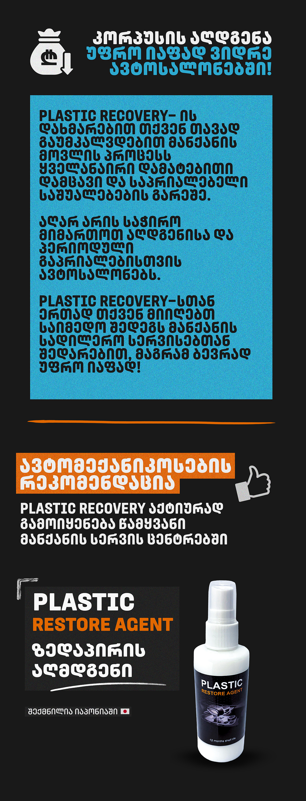 არც ისე დიდიხნის წინ მეგობრები განვიხილავდით ამ საპრიალებელ საშუალებას და გადავწყვიტეთ გვეცადა. მოკლედ, Plastic recovery საუკეთესო საშუალება აღმოჩნდა, ჩემი ძველი ნისანი ახალივით გამოიყურება!