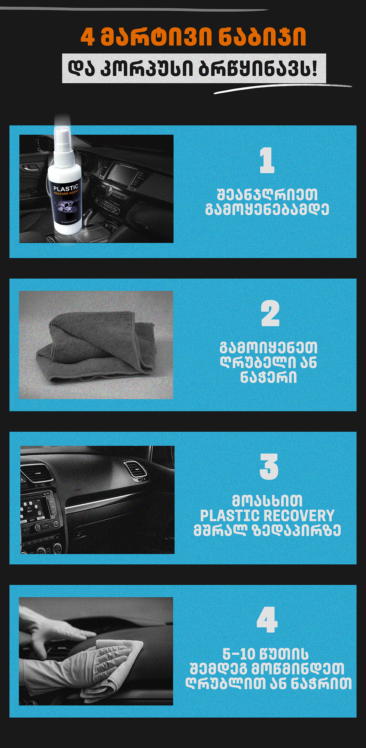 შემიძლია ერთი რამე ვთქვა, Plastic recovery –ეს არის საშუალება მათთვის, ვინც ზრუნავს საკუთარ ავტომობილზე! ის კარგად ფარავს პატარა ნაკაწრებს. აუმჯობესებს სალონის იერს. პირადად მე ისეთი შეგრძნება მაქვს, რომ მანქანა სალონიდან ახლახანს გამოვიყვანე!